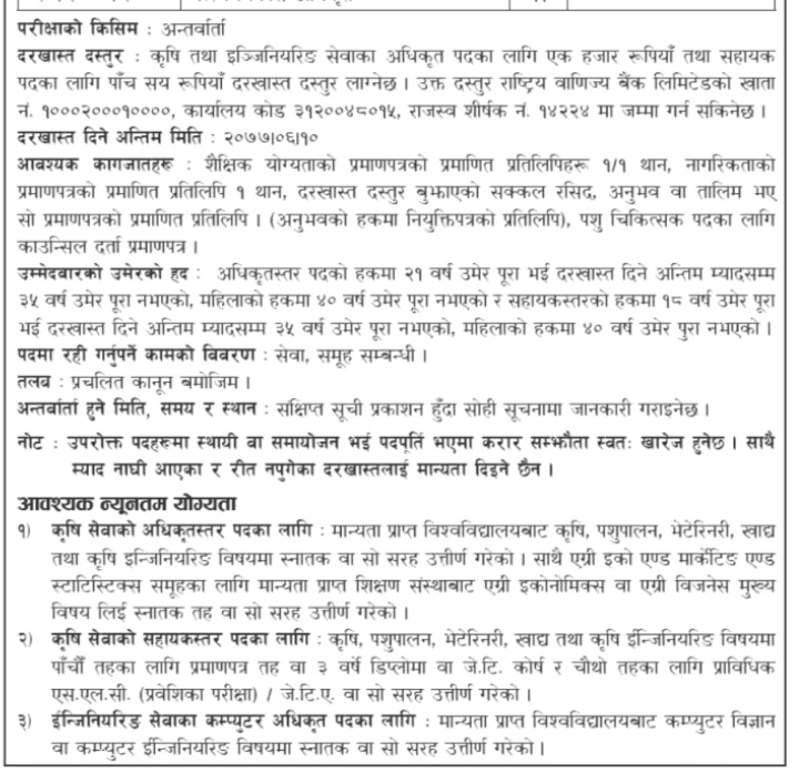 बुटवल, २७ भाद्रः भूमि व्यवस्था, कृषि तथा सहकारी मन्त्रालय, प्रदेश नं. ५ सरकार बुटवलले प्रदेश भित्रका एक स्थानीय तहका लागि एक जना गरी जम्मा १०९ जना कृषि/पशुसेवाका अधिकृत तथा मन्त्रालय र मातहतका कार्यालयहरूमा ६८ जना कृषि सेवाका अधिकृत तथा सहायक जनशक्ति सेवा करारमा नियुक्त गर्ने सम्बन्धि सूचना आजकाे गाेरखापत्र राष्ट्रिय दैनिकमा प्रकाशन भएको छ ।